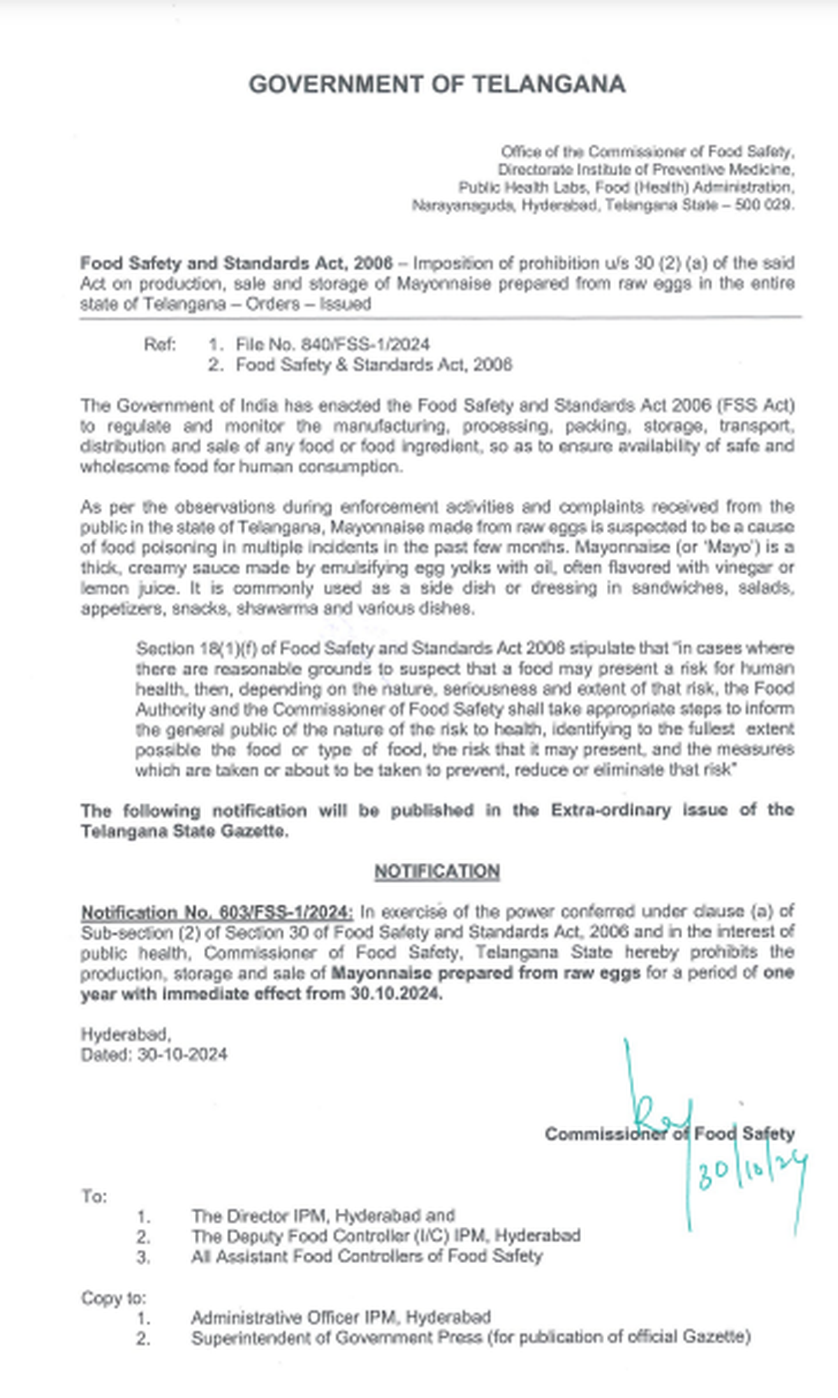 In a bid to address potential public health risks, the Telangana government has officially banned the production, sale, and storage of mayonnaise made from raw eggs across the State. This prohibition order, issued by the Commissioner of Food Safety, came into effect on October 30 and will be in force for one year. The order cited Section 30 (2) (a) of the Food Safety and Standards Act, 2006 for imposition of the prohibition.