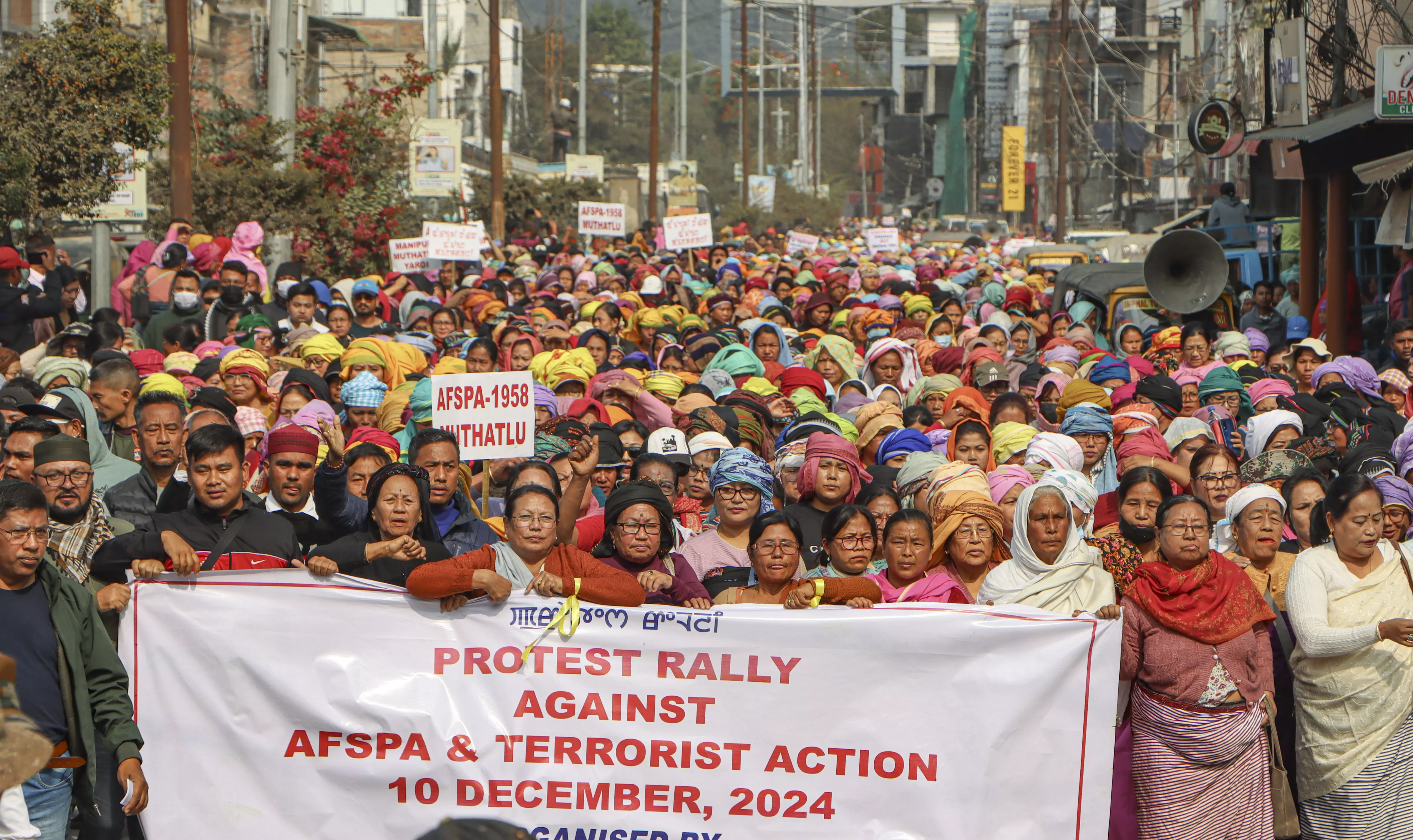 Protesters carried placards and banners demanding the complete withdrawal of AFSPA from Manipur and other northeastern states, accusing the act of fostering impunity and perpetuating human rights abuses in the region.