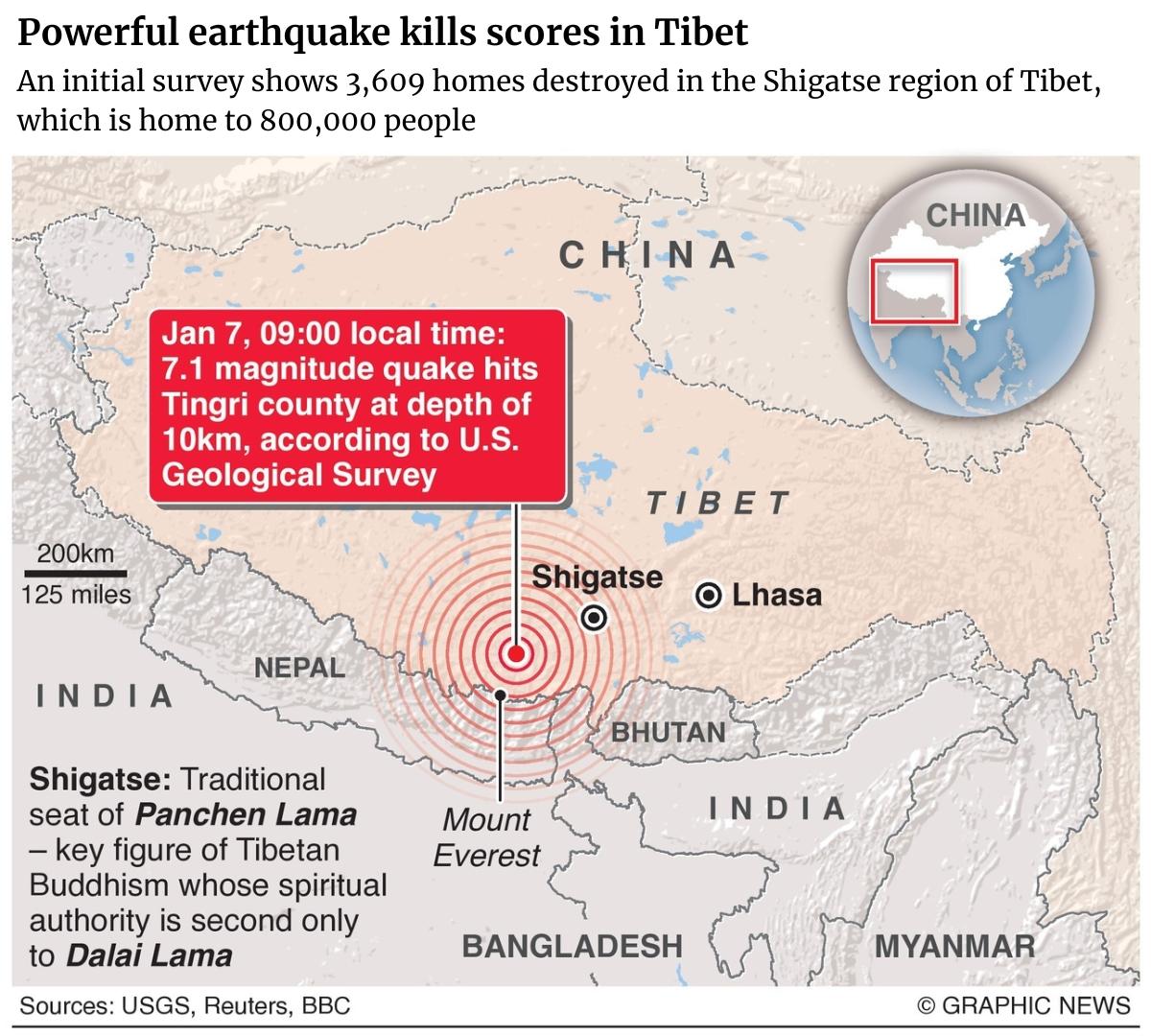 The epicentre of Tuesday’s (January 7) magnitude 7.1 quake, one of the region’s most powerful tremors in recent years, was located in Tingri in China’s Tibet region, about 80 km (50 miles) north of Mount Everest, the world’s highest mountain. It also shook buildings in neighbouring Nepal, Bhutan and India.