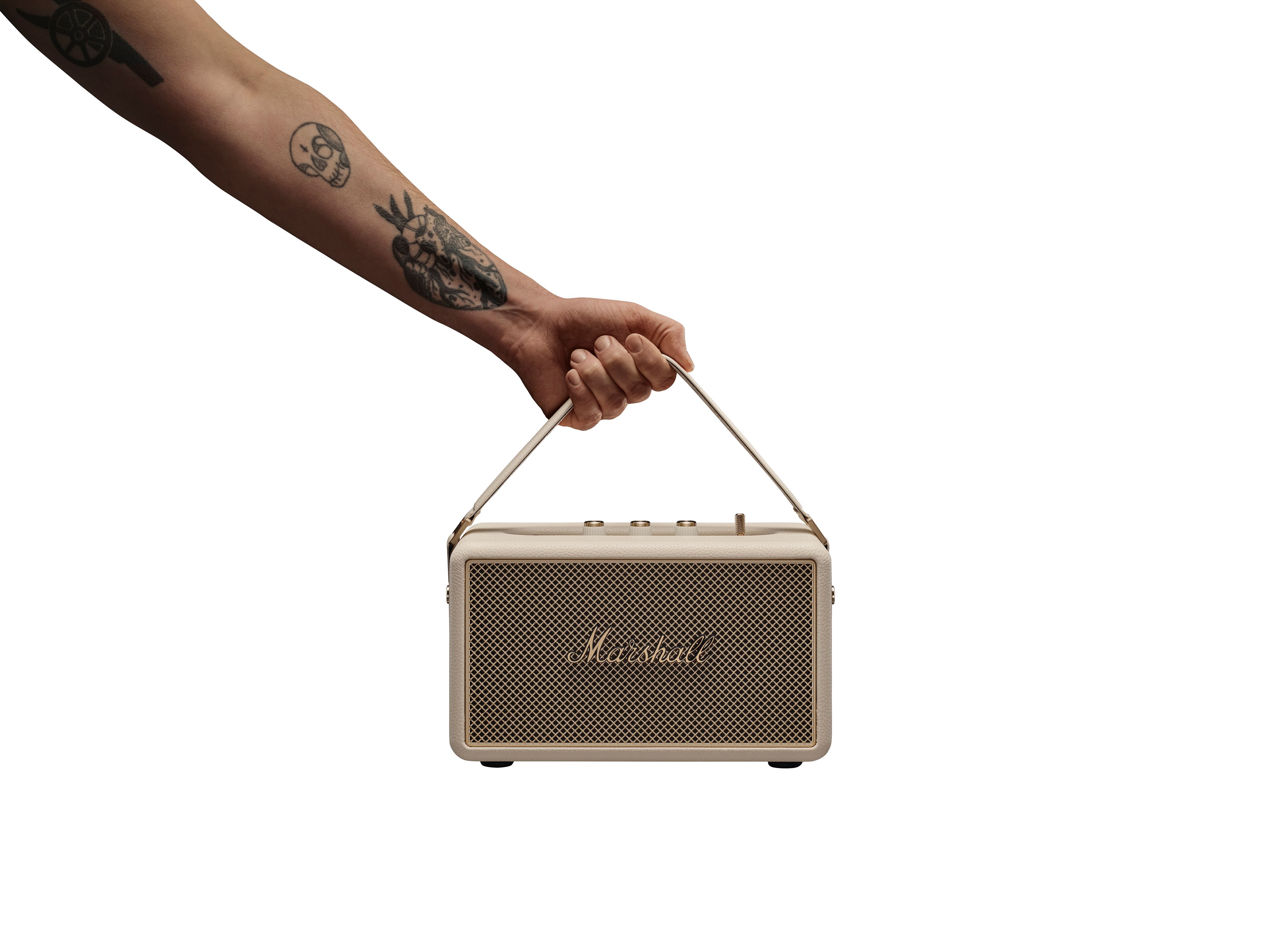 The speaker maintains Marshall’s signature aesthetic with tactile control knobs and IP54 water resistance.