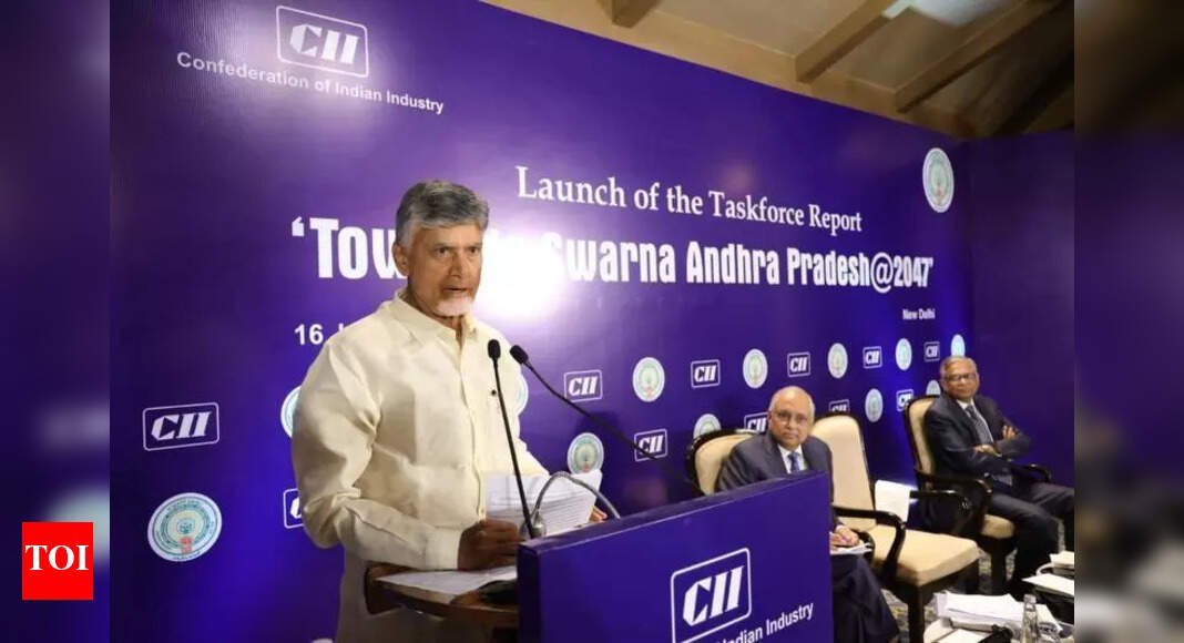Vijayawada: Chief Minister N Chandrababu Naidu unveiled the report of the taskforce constituted with industry experts to suggest the way forward to achieve the goals of Swarnandhra Vision 2047. The taskforce, chaired by Naidu and co-chaired by Tata Sons chairman Natarajan Chandrasekharan, made various suggestions on improving the macro-economic situation, growth drivers in key sectors, new opportunities, and industry collaborations required.The report highlighted the need for restoring industry confidence and improving the fiscal situation, with recommendations for balanced regional growth. Identifying agriculture as a key growth driver, the taskforce suggested expediting the integration of technology to improve productivity and harnessing untapped potential in the food processing sector.The report also focused on growth opportunities in life sciences, electronics and semiconductors, IT, AI, and data centers in Andhra Pradesh. Additionally, it outlined opportunities in the automotive industry, textiles, aerospace, defense, space, tourism, and mining sectors. The taskforce report discussed new opportunities in the form of the blue economy, renewable energy, advanced manufacturing, and innovation.Speaking on the occasion, chief minister Chandrababu Naidu said that by promoting investments and boosting exports, Andhra Pradesh can achieve economic growth envisioned in the Swarnandhra vision document. Naidu stated that Amaravati will become the most futuristic city with world-class infrastructure and the first city to use only green energy. He explained the investor-friendly policies and the government’s focus on creating an environment for the speed of doing business, appealing to investors to come forward and invest in Andhra Pradesh.Tata Sons chairman Chandrasekharan praised Naidu for his vision and setting ambitious goals of a 15% growth rate in the next 20 years and becoming a $2.4 trillion economy. He recollected how Hyderabad developed as the hub of the IT sector with the proactive steps taken by Naidu 25 years ago.