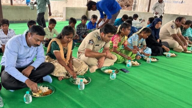 EAGLE Chief Ake Ravikrishna and Kurnool SP Vikrant Patel having lunch with the students after participating in the Mega PTM 2.0, at Zilla Parishad school in Kappatralla, on Thursday.
