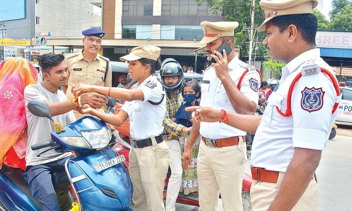 Hyderabad: Traffic police in the Rachakonda Commissionerate marched out on the streets armed with rakhis on Saturday to ensure road safety with a festive flair this Raksha Bandhan.