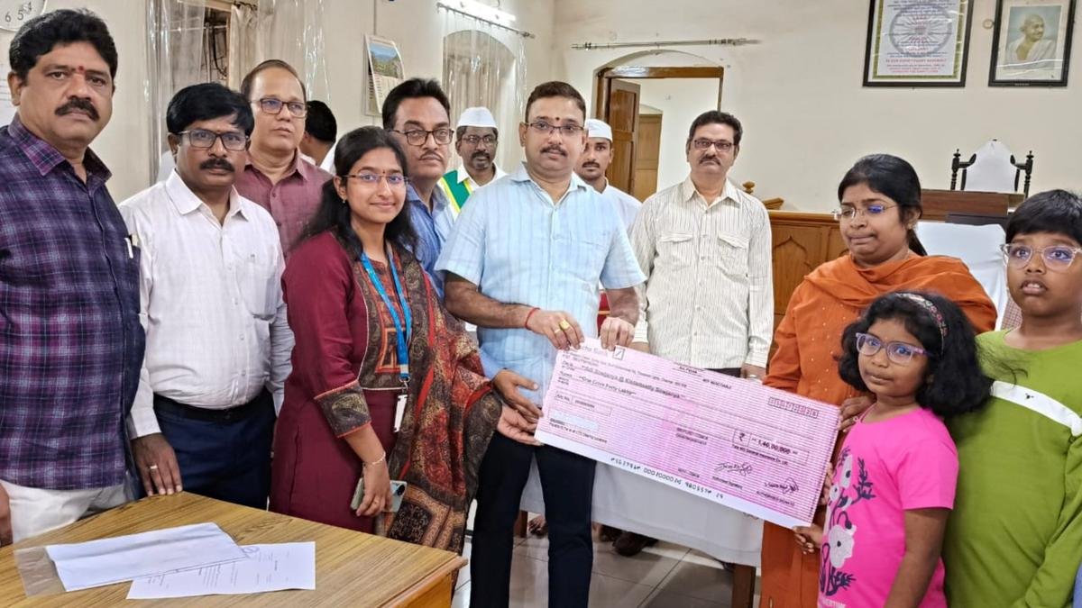 B. Sai Kalyan Chakravarthi, Chairman of the District Legal Services Authority and Principal District and Sessions Judge, handing over the cheque to the victim’s family members on Saturday, after settling a dispute in Lok Adalat, related to an accident.