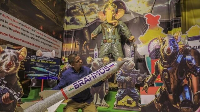 An artist prepares an Operation Sindoor themed ‘pandal’ ahead of Ganesh Chaturthi festival, in Hyderabad, Sunday (August 24, 2025)