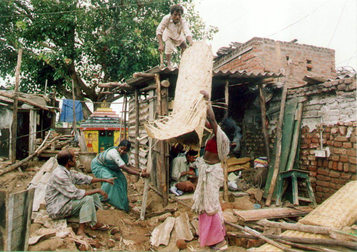 Villagers rebuld their homes after they were destroyed by floods following the heaviest rains in decades in Hyderababd on August 30, 2000.