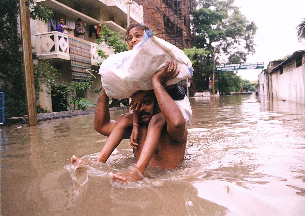 Residents living on the banks of a canal assess the damage after it overflowed following incessant rains in Hyderabad on August 27, 2000.