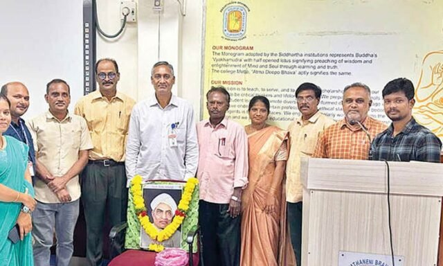 The ceremony began with Principal Dr Meka Ramesh and Dean Prof Rajesh C Jampala garlanding a portrait of Gidugu and offering their respects. Other attendees included Assistant Professors Dr SaSri, Dr Y Poornachandra Rao, Dr PBDV Prasad and Dr. Hema Bandhavi.