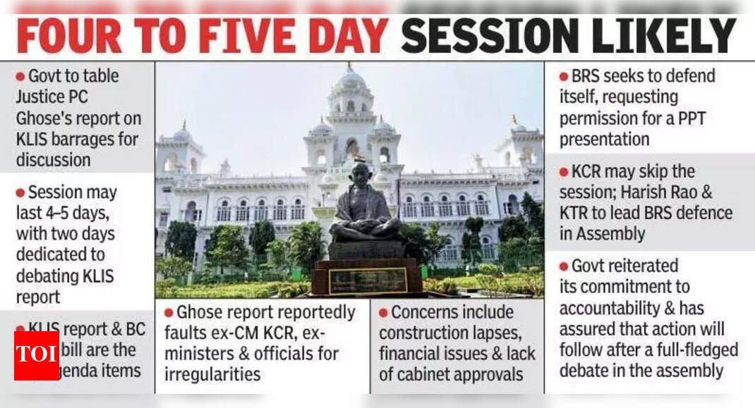Hyderabad: The state assembly’s monsoon session, beginning Saturday, is expected to be stormy, with the state govt preparing to table the much-awaited report of the one-man commission led by Justice PC Ghose on the three barrages of the Kaleshwaram Lift Irrigation Scheme (KLIS).The report will be formally placed before the House for discussion, paving the way for decisions on future action. The session is likely to run for four to five days, with the govt considering dedicating at least two full days to debating the commission’s findings. The final agenda will be set by the business advisory committee, which meets on Saturday afternoon. Key agenda items According to official sources, two major issues are expected to dominate the session: The Kaleshwaram barrages report and an amendment to Backward Classes (BC) reservations, which seeks to remove the 50% ceiling by amending the Telangana Panchayat Raj Act and the Telangana Municipalities Act. The Ghose Commission submitted its voluminous 650-page report to the govt on July 31. The cabinet has already examined its contents and announced its intent to act on the findings. The report reportedly faults former chief minister K Chandrasekhar Rao, ex-ministers T Harish Rao and Eatala Rajender, along with several IAS officers and senior irrigation officials, for lapses in the execution of the KLIS barrages. Key concerns highlighted include: Irregularities in construction and financial discrepancies, failure to secure proper cabinet approvals, compromises in construction quality and premature issuance of completion certificates. The govt has reiterated its commitment to accountability and has assured that action will follow after a full-fledged debate in the assembly.BRS strategy to defend Meanwhile, the BRS is gearing up for a combative defence. Party leaders have formally requested permission from the speaker to present their side through a detailed powerpoint presentation (PPT) on the Kaleshwaram project. However, the speaker is unlikely to grant such permission.In anticipation, KCR convened a strategy meeting with senior leaders KT Rama Rao and Harish Rao to chalk out a plan. If the PPT is disallowed, the party will seek adequate time on the floor to explain its version of events and counter the govt’s charges. Though leader of the opposition KCR is unlikely to attend the session in person, he is expected to entrust Harish Rao and KTR with the responsibility of taking on the govt during the debate, sources said.