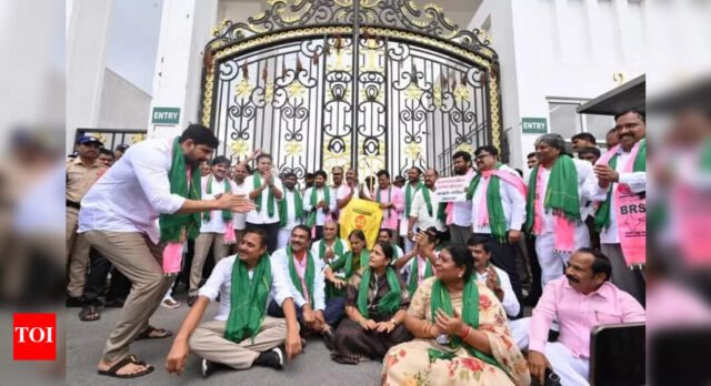 Hyderabad: The BRS staged a protest over the fertiliser shortage in the state, blaming both the Congress govt and the Centre for the crisis. Soon after the assembly was adjourned for Sunday, BRS MLAs and MLCs, including KT Rama Rao and Harish Rao, staged protests at the Telangana agriculture commissionerate, and Gun Park, carrying empty urea bags.Blaming the Congress govt, KTR said that such a severe shortage of urea was unimaginable during the decade-long BRS rule. “Why are farmers now forced to stand in endless queues, leaving behind their footwear and Aadhaar cards just to hold their place? This is a direct result of Congress’ incompetence and failure to manage the agricultural sector,” he said.BRS leaders, who held a protest at Gun Park initially, held dharna at the agriculture commissioner’s office after submitting a representation demanding immediate urea supply to farmers. Later, they shifted their protest to the secretariat, where the police detained Harish Rao and other MLAs. The BRS condemned the use of force against elected representatives, stating that they were only highlighting the genuine grievances of farmers.KTR demanded a 15-day special assembly session, stating that the BRS was ready to debate any issue—from the fertiliser crisis and farmer suicides to irrigation projects like Kaleshwaram. He alleged that over 600 farmers took their lives in recent months due to the unbearable agricultural distress under Congress rule. “They promised Six Guarantees but have delivered nothing but deception. Farmers are on the streets, students await fee reimbursements, yet the govt hides behind excuses,” he charged.The BRS leader made it clear that the party will continue to hold the Congress govt accountable for what he described as a disastrous collapse of governance and a profound betrayal of Telangana’s people. Harish Rao said the Congress govt completely failed to address the problems of farmers.