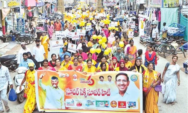 Nellore: Women in large numbers, led by Ponguru Ramadevi, wife of Municipal Administration Minister Ponguru Narayana, take out a rally here on Saturday, praising the coalition government headed by Chief Minister N Chandrababu Naidu for successfully implementing ‘Super Six’ scheme.