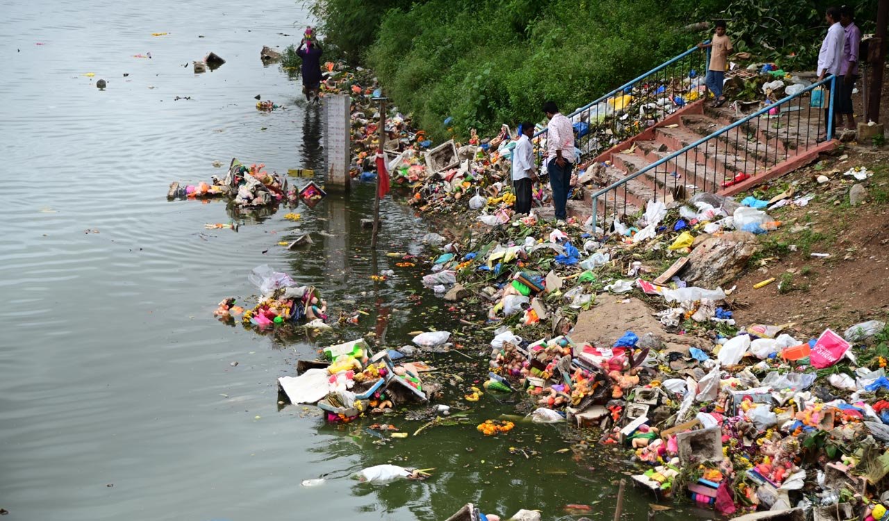 The GHMC claims to have deployed special sanitation teams at the artificial ponds to remove the waste, but the situation on the ground tells a different story. Similar conditions can be seen along the shorelines of Hussain Sagar.