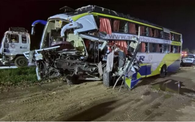 The bus, carrying 31 passengers from Hyderabad to Proddatur, collided with the lorry moving ahead. The deceased were identified as Address Unnisa (70), Hassan (35), and Yellamma (45).