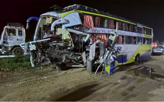 Mahabubnagar: Three people were killed and five others sustained serious injuries when a private travel bus rammed into a container lorry on National Highway 44 near Katavaram Stage in Addakula mandal late on Saturday.
