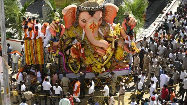 The grand spectacle, known for marking the finale of the Ganesh festivities, moved steadily before halting at the Mahatma Gandhi Bus Station (MGBS). The pause allowed several smaller idols from nearby localities to pass, while police marshals coordinated movements to clear the way for the larger convoy to continue towards Tank Bund for immersion.