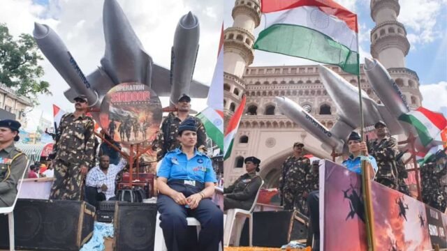 Hyderabad: Ganesh idol trucks themed around Operation Sindoor passed through Charminar during Hyderabad’s Ganesh Chaturthi immersion on Saturday, September 6.