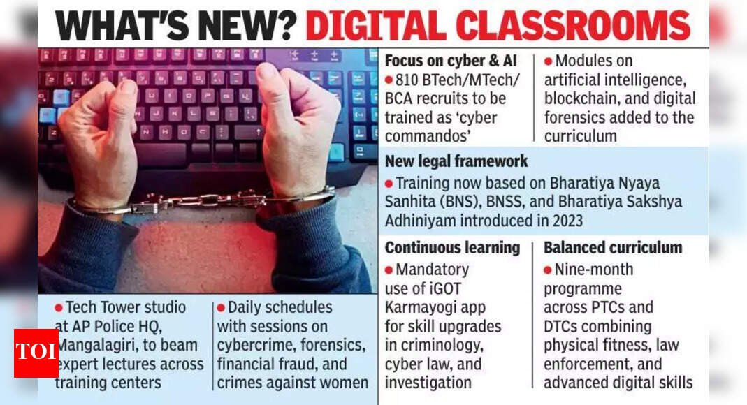Vijayawada: Andhra Pradesh is overhauling its police training system to match the demands of modern-day crime, moving beyond traditional drills and law-and-order focus to a curriculum that prepares constables to fight cybercrime, financial fraud, and digital threats.For the first time, the state will blend conventional physical and law enforcement training with advanced technology-based modules. Alongside parade grounds and weapon handling, recruits will now spend hours learning about digital forensics, blockchain technology, AI-driven policing, and cyber investigation methods.A dedicated digital learning studio, set up at the Tech Tower inside the AP police headquarters at Mangalagiri, will deliver live and recorded expert sessions to training centers across the state. Cyber specialists, forensic experts, and investigators of financial crimes will teach classes virtually, covering areas such as online fraud, cyber abuse, and crimes against women. Recruits will receive a daily training schedule linking them to these sessions.The syllabus also reflects India’s new legal framework. Instead of the Indian Penal Code, CrPC, and Evidence Act, trainees will now be instructed on the Bharatiya Nyaya Sanhita (BNS), Bharatiya Nagarik Suraksha Sanhita (BNSS), and Bharatiya Sakshya Adhiniyam introduced in 2023.Another significant shift is in tapping the educational background of the recruits. Of the 6,024 new constables, 810 hold professional degrees such as BTech, MTech, and BCA. These candidates are being earmarked for intensive training as ‘cyber commandos,’ while others with postgraduate and law degrees will be utilized for specialized roles.The nine-month programme will continue at police training colleges in Vizianagaram, Ongole, Tirupati, and Anantapur, and district training centers, but with an expanded scope. Sessions on victim handling, financial investigation, and digital evidence will run alongside the standard regimen of physical fitness, discipline, and law enforcement basics.In addition, every trainee will be required to use the Ministry of Home Affairs’ iGOT Karmayogi app, enabling continuous skill development in areas like criminology, cyber law, and forensic science throughout their career.Director general of police (DGP) Harish Kumar Gupta said the changes were aimed at reshaping the force for contemporary challenges. “Just as Greyhounds were created to fight Maoists, today’s recruits are being prepared as cyber commandos. This is not just training for today, but for the future of policing in Andhra Pradesh,” he said.
