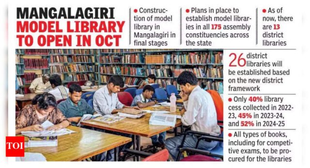 Vijayawada: IT and HRD minister Nara Lokesh on Monday announced that a world-class state library with international standards will be constructed in Amaravati at a cost of 150 crore. Responding to questions raised by MLAs Mandali Buddha Prasad, Palle Sindhura Reddy, and Ganababu in the assembly, Lokesh said steps are being taken to complete the construction of the central library within 24 months. Efforts are also underway to improve infrastructure in libraries across the state and to preserve manuscripts, he added.He said industries minister TG Bharath has roped in Shobha Developers to donate 100 crore for the development of libraries in the state. “With the support of donors, measures are being taken to further develop libraries. A model library is being constructed in Visakhapatnam at a cost of 20 crore. We are also initiating measures to collect pending library cess dues from local bodies and civic bodies to strengthen libraries in the state. Consultations with ministers of panchayat raj and municipal administration are underway to recover the pending dues,” said Lokesh.He admitted that there is a need to ponder over fostering reading habits among children and the younger generation. “Reading books is a way to make the brain creative and also reduce screen time. The govt will ready a blueprint to make libraries multipurpose halls where some events can take place to involve the younger generation in creative activity, including the conduct of quiz and essay writing competitions, and sessions with cartoonists,” he added, while promising to take constructive steps to bring awareness among parents as well as children.Former minister and legislator Mandali Budha Prasad said there is a need to discuss with managements of schools, colleges, and academicians to inculcate the habit of reading books among children. He said celebrities and VIPs should propagate the issue to make children turn towards books as they will make them responsible citizens. He said a special hour must be introduced in schools exclusively to read books.