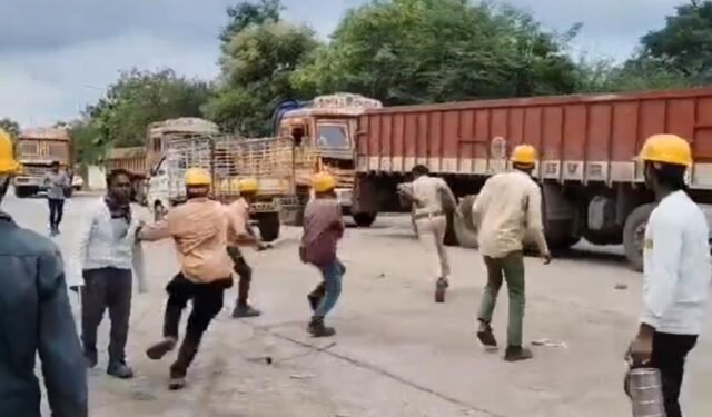 Tension erupted at Deccan Cements Limited in Palakeedu, Suryapet, when migrant workers demanding ex gratia for a deceased colleague clashed with police. A police vehicle was damaged, personnel suffered minor injuries, and several workers were taken into custody after stone pelting