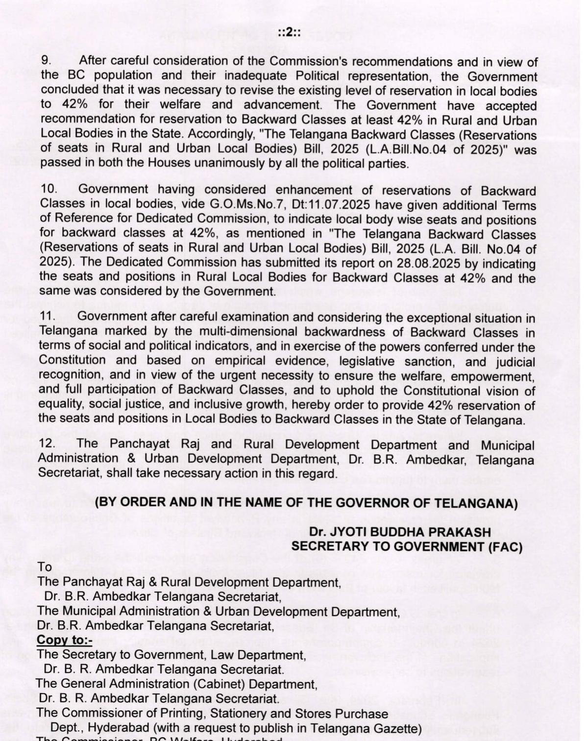 The government, after careful consideration of the Commission’s recommendation and in view of the BC population’s inadequate political representation, concluded that it was necessary to revise the existing level of reservation in rural and urban local bodies to 42 % for their welfare and advancement and “The Telangana Backward Classes (Reservation of Seats in Rural and Urban Local Bodies) Bill, 2025” was passed by both houses of the Legislature unanimously by all the political parties.