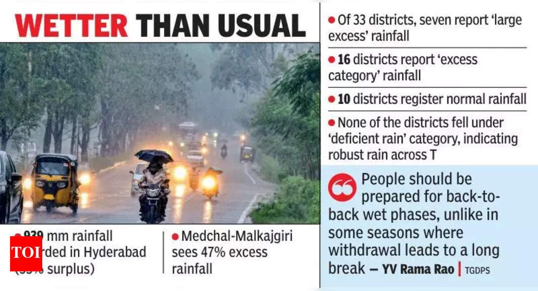 Hyderabad: Telangana recorded 31% excess rainfall this southwest monsoon (SWM) season, with the India Meterological Department (IMD) projecting its withdrawal between Oct 15 and 20.The state is expected to see continued rainfall thereafter, as the northeast monsoon is set to bring showers, ensuring no prolonged dry spell this month. According to data from the Telangana Development Planning Society (TGDPS), between June 1 and Oct 4, the state received 991.5 mm of rainfall, compared to an average of 756.7 mm. “This was a surplus season across most districts. Even after the southwest monsoon withdraws, the northeast monsoon will follow quickly, so rainfall activity will remain high throughout Oct,” said Balaji Tarini, a Telangana-based independent forecaster. Out of the 33 districts, seven reported ‘large excess’ rainfall, 16 were in the ‘excess’ category and 10 registered ‘normal’ rainfall. None of the districts fell under the ‘large deficient’ or ‘no rain’ categories, reflecting a robust season across the state.Hyderabad recorded 939 mm of rainfall against an average of 697.6 mm, which equates to a 35% surplus. Neighbouring districts also saw higher-than-usual shower — Rangareddy reported 42% excess, while Medchal–Malkajgiri registered 47% excess. Officials noted that Aug and Sept contributed significantly to this surplus, with multiple intense spells boosting seasonal totals.Farmers are expected to benefit from the extended rains, as water levels in reservoirs and groundwater recharge remain healthy. However, urban areas, especially Hyderabad, may be at risk of waterlogging with continuous wet weather. “The good news is that reservoirs are brimming, which secures water availability. But urban flooding remains a challenge if the northeast monsoon coincides with heavy localised rainfall,” said an IMD official.Experts noted that a brief dry spell of two–three days is likely during the transition period, but stressed that this will not lead to prolonged dryness. “People should be prepared for back-to-back wet phases this year, unlike in some seasons where withdrawal leads to a long break,” added YV Rama Rao from TGDPS.