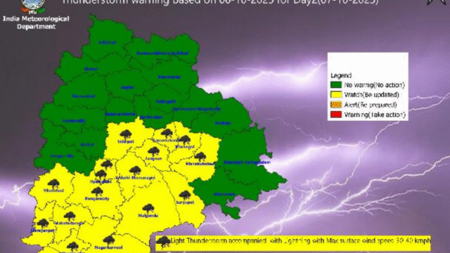 According to the IMD’s latest bulletin, thunderstorm accompanied with lightning and gusty winds are very likely to occur at isolated areas in Nalgonda, Suryapet, Mahabubabad, Warangal, Hanamkonda, Jangaon, Siddipet, Yadadri Bhongir, Rangareddy, Hyderabad, Medchal Malkajgiri, Vikarabad, Mahabubnagar, Nagarkurnool, Wanaparthy, Narayanpet and Jogulamba Gadwal districts.