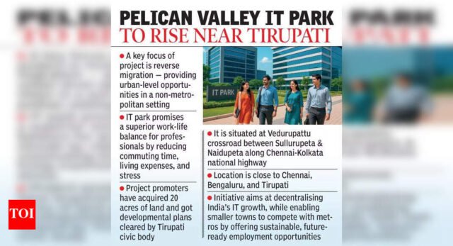 Vijayawada: In a move to transform barren lands into an innovation hub, a group of US-based IT professionals and financial experts have decided to develop a dedicated IT project near Tirupati. The initiative, named Pelican Valley IT Park, is expected to become the next IT hub in southern AP. Conceived as a transformative private initiative, the project is designed to create a world-class ecosystem for technology, innovation, and employment aimed at bridging the gap between industry demand and untapped potential of thousands of skilled graduates from the region.The NRI promoters have already acquired about 20 acres of land and got the developmental plans cleared by the Tirupati Urban Development Authority (TUDA). “Situated at Vedurupattu crossroad between Sullurupeta and Naidupeta along the Chennai-Kolkata national highway (NH-16), Pelican Valley offers exceptional strategic advantages. The location ensures seamless connectivity to major south Indian cities — Chennai, Bengaluru, and Tirupati. It is also close to key industrial and educational centres such as IIT-Madras, IIT-Tirupati, ISRO facility at Sriharikota, and Sri City SEZ. With its affordable housing options and minimal congestion, Pelican Valley will offer employees the chance to enjoy a better quality of life without compromising career growth,” said project promoter Vani Kunisetty.Pelican Valley IT Park is backed by a consortium of private investors, mostly NRIs, with a clear mission to generate sustainable, well-paying jobs for underemployed graduates and to create an environment that combines operational efficiency for employers with a balanced, stress-free lifestyle for employees. Kunisetty said they want to develop the project as south India’s most dynamic white-collar employment hub, where affordability, innovation, and social impact can converge.The project’s first phase covers 20 acres of land, already acquired and zoned by the Tirupati Urban Development Authority for vertical development. This zoning allows for high-density IT infrastructure and commercial complexes that can grow vertically and expand outward as demand accelerates.Project managing director MV Rao said India’s employment landscape is marked by a paradox. “Millions of graduates remain unemployed or underpaid despite a booming IT industry facing a shortage of trained manpower. Pelican Valley plans to bridge the gap by offering customised, project-based training focused on real-world skills rather than theoretical knowledge. Training programmes will be tailored to individual capabilities, ensuring that graduates are industry-ready and confident. Partner companies will be invited to conduct recruitment drives directly on campus, linking education, training, and employment in one seamless continuum,” explained Rao.Beyond job creation, Pelican Valley has readied plans to become a centre of technological innovation, he said, adding that future development plans include incubation centres for startups, R&D and innovation facilities, and dedicated office spaces for both product and service-based IT firms. The park will actively collaborate with IITs, universities, and leading corporate partners to encourage research partnerships, internships, and collaborative projects that nurture creativity and entrepreneurship.