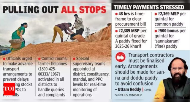 Done: arun Hyderabad: In what is being billed as one of the largest grain procurement drives in the country, Telangana is gearing up to purchase 80 lakh metric tonnes of paddy this kharif season, valued at around ₹23,000 crore, civil supplies minister N Uttam Kumar Reddy said on Wednesday. Chairing a video conference with district collectors and civil supplies officials to review procurement preparedness, Uttam said the state expects a record kharif harvest of 1.48 crore metric tonnes of paddy, cultivated across 66.8 lakh acres. The govt plans to procure 40 lakh MTs of fine (sanna) and 40 lakh MTs of coarse (doddu) varieties. “This remarkable achievement reflects the farmer-friendly policies of chief minister A Revanth Reddy and deputy chief minister Bhatti Vikramarka. Telangana today stands as a symbol of agricultural progress, and we will continue to strengthen this reputation,” Uttam said. He directed collectors to treat the procurement exercise as a mission-mode operation and ensure that no farmer faces delays or hardship at the procurement centres. “Collectors must personally supervise arrangements and make additional spending where necessary without delay. If there is an urgent requirement, go ahead — the govt will issue post-facto approvals,” he said. As of mid-Oct, 8,342 paddy procurement centres (PPCs) have been sanctioned across the state, with 1,205 already operational in key paddy-growing districts such as Kamareddy, Nizamabad, Medak, Siddipet, and Nalgonda. Each PPC will be equipped with calibrated weighing scales, moisture meters, paddy cleaners, dryers, tarpaulins, and digital calipers, and collectors were told to immediately address any shortfalls. Uttam also emphasised timely payments, directing officials to clear dues within 48 hours of procurement. The MSP for the 2025-26 kharif season has been fixed at ₹2,389 per quintal for grade A and ₹2,369 per quintal for common paddy, with an additional ₹500 per quintal bonus for ‘sannarakam’ (fine) paddy sold at state-notified centres. He urged officials to make advance transport arrangements to prevent delays in moving stocks from PPCs to rice mills. “Transport contractors must be finalised early. Separate arrangements should be made for sanna and doddu paddy to avoid confusion during milling,” he said. Agriculture minister Tummala Nageswara Rao and chief secretary S Ramakrishna Rao also reviewed district-wise readiness, including the availability of gunny bags, infrastructure, and moisture meters. GFX:Control rooms and farmer helplines (1800-425-00333 / 1967) have been activated in all districts to handle queries and complaints. Special supervisory teams have been appointed at the district, constituency, mandal, and PPC levels for real-time monitoring of operations.