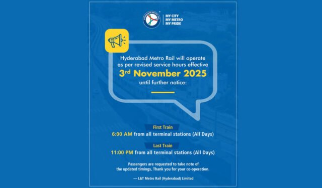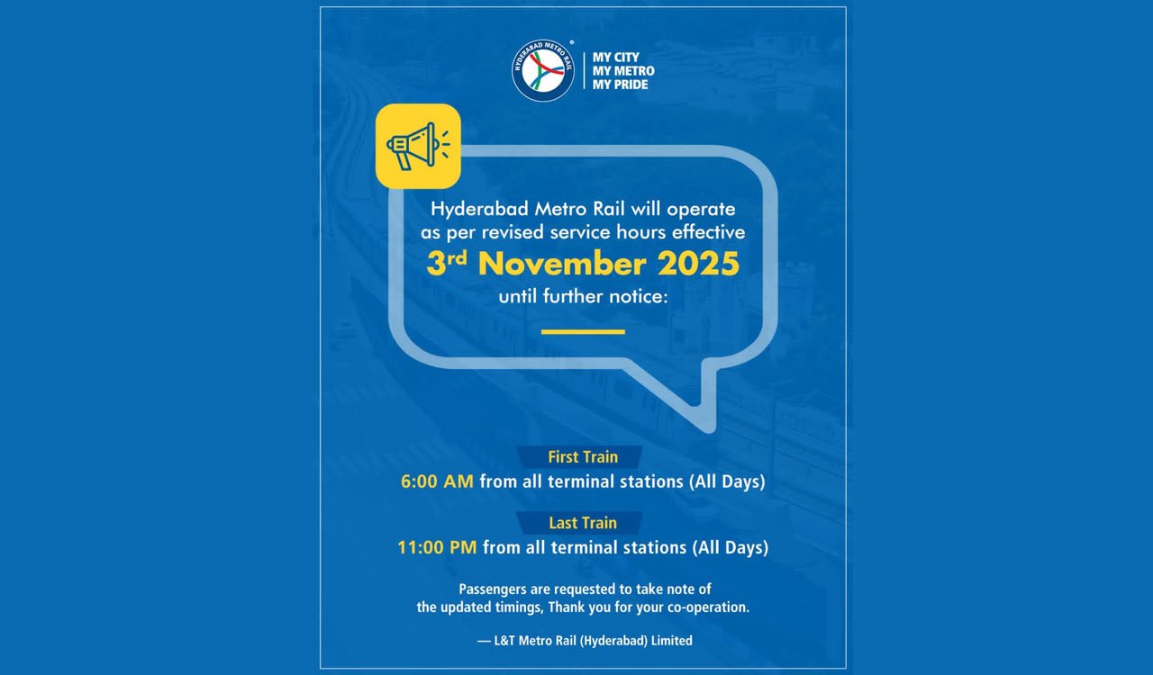 The Hyderabad Metro Rail has revised its schedule, with the last train now departing at 11 pm from November 3. Services will run from 6 am to 11 pm daily, affecting late-night commuters and those returning from work or shopping.