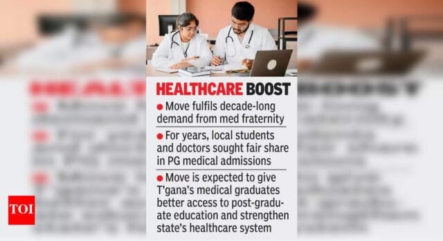 Hyderabad: The state govt on Saturday approved 85% local reservation in post-graduate (PG) management quota–1 (MQ–1) seats in private medical colleges, marking a major policy change to benefit Telangana students. A GO formalising the 85% local quota is expected to be released soon.The decision is expected to benefit local students as 318 PG medical seats and 70 PG dental seats would now be reserved for Telangana medicos. Until now, nearly 60% of these seats were being filled by non-local candidates.Until now, MQ–1 seats were open under the all India category, allowing candidates from across the country to apply. With the new policy, 85% of these seats would now be reserved for Telangana students, while the remaining 15% would continue to be open to all India candidates.The decision fulfils a decade-long demand from Telangana’s medical fraternity. For years, local students and doctors sought a fair share in PG medical admissions, pointing to the limited govt quota seats and the heavy fee in private colleges.The move is expected to give Telangana’s medical graduates better access to post-graduate education and strengthen the state’s healthcare system by ensuring that more doctors trained in Telangana continue to serve locally.On the occasion, health minister Damodar Rajanarasimha said that it was a historic and long-awaited decision that fulfils the dreams of thousands of Telangana medicos. The Healthcare Reforms Doctors Association (HRDA), which raised the cause, welcomed the move along with the Telangana Junior Doctors Association (T-JUDA).