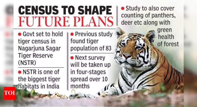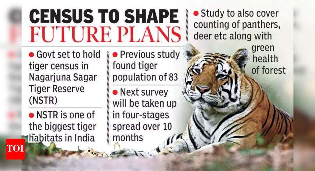 Vijayawada: The forest department is preparing to launch the next round of tiger census in the Nagarjuna Sagar Tiger Reserve (NSTR), which spans Palnadu, Prakasam, and Nandyal districts. Recognized as India’s largest tiger habitat, NSTR will be part of the All India Tiger Estimation 2026, a nationwide exercise conducted every four years by the Wildlife Institute of India (WII) and the National Tiger Conservation Authority (NTCA). The census will run from Nov to March, depending on regional conditions.A workshop on census protocols is scheduled for Nov 5, as authorities aim to accurately document the growing tiger population amid expanding habitats. The four-tiered methodology will include ground tracking, satellite imaging, camera trapping, and data analysis to ensure precision.Spread across 3,296.31 sq km, NSTR has seen a steady rise in tiger numbers—from 48 in 2014 to 62 in 2018, and 73 by 2022. Latest estimates suggest the population has now crossed 86, thanks to sustained conservation efforts.The upcoming census will also monitor other species including leopards, bears, deer, wolves, wild dogs, and various herbivores and carnivores. Surveyors will assess forest cover, habitat health, and ecological changes.Officials noted that tigers are dispersing into new zones via a dedicated corridor linking Nallamala to Seshachalam forests in Kadapa, Nellore, and the erstwhile Chittoor districts. Increased sightings in Lankamalleswara Sanctuary (Kadapa) and Penchala Narasimhaswami Konda (Nellore) indicate successful expansion.The census blueprint outlines a 10-month timeline. “We’ll begin by collecting footprints, scat, and tree markings. This will be followed by satellite imaging and the installation of dual trap cameras every 4 sq km. The final phase will involve data analysis to determine accurate population figures,” said a senior forest official. As India’s national animal inches toward recovery, the census underscores efforts to prevent extinction and strengthen protected zones. “The results will guide future conservation strategies to sustain the roar in the wild,” the official added.
