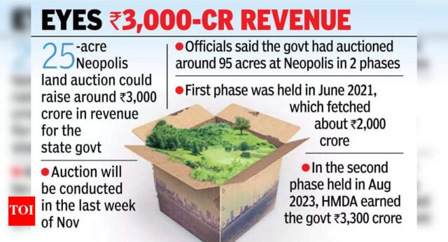 HYDERABAD: The Telangana State Industrial Infrastructure Corporation (TGIIC) now has a competitor when it comes to raking in revenue by auctioning govt land. The Hyderabad Metropolitan Development Authority (HMDA) is gearing up for the sale of around 25 acres of land in Nov at Neopolis layout in Kokapet, which could raise around 3,000 crore in revenue for the state govt. While the authority plans to issue a notification in the first week of Nov or after the Jubilee Hills bypoll, the auction will be conducted in the last week of Nov, if all goes as per plan. HMDA metropolitan commissioner Sarfaraz Ahmad said the authority plans to conduct phase-3 of the Neopolis auction for 25 acres next month.