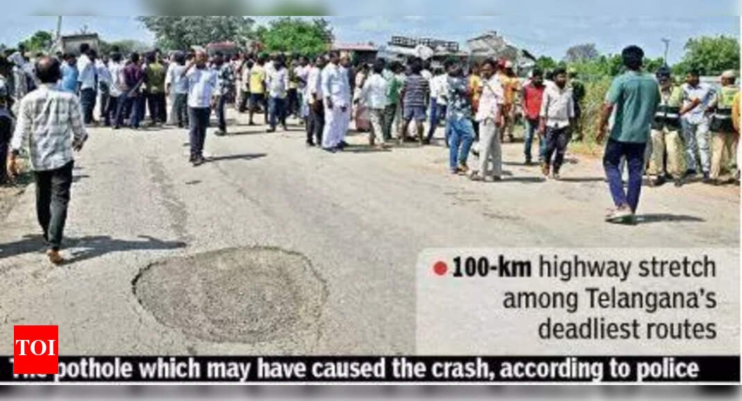 Hyderabad: The 100-km Hyderabad-Bijapur highway stretch — starting from Appa Junction near the Telangana Police Academy to Tandur via Manneguda — has turned into one of the deadliest routes in the state, claiming over 200 lives in the past six years, show police records.When TOI travelled along this road – following Monday’s ghastly crash — it found that only the 10-km stretch from APPA Junction to Moinabad was a four-lane road. Thereafter, up to Chevella was a narrow two lane road without any medians. In fact, locals from villages on two sides of the stretch said that the situation is much the same right through Manneguda to Tandur.300 potholes, 60 sharp turns“It is still a snake-like road that winds through uneven terrain,” said Ramesh Kumar, a local who has been fighting for the repair of this road for 10 years. He added: “The 45-km stretch between Appa Junction and Manneguda alone has nearly 300 potholes and 60 sharp turns, making it a nightmare for both commuters and long-distance travellers.”TOI also observed how vehicles plying in opposite directions – in stretches like Chevella – were swerving freely across lanes at high speeds raising chances of collisions — particularly around blind curves. Adding to the danger is the absence of proper signage and road markings, and broken crash barriers.“This gets worse in the night at Mirjaguda,” says P Pentaiah, a local from the area adding that at night, the lack of reflectors and functional streetlights turns the entire stretch till Tandur into a dark trap for motoristsHeavy vehicle movementLocals say how the drive becomes riskier owing to the movement of over 1,000 trucks and tankers daily — mostly cement-laden carriers from Tandur and soil trucks from Vikarabad and Nawabpet, allege locals. Most of these vehicles are overloaded, carrying up to 70 tonnes — nearly four times their permitted limit — severely damaging the road surface and increasing the risk of accidents, they allege.“I have travelled on the Vikarabad road at least three times, where the majority of the stretch is undivided. I saw vehicles overtaking recklessly without even estimating the speed of oncoming traffic. I myself had to veer off the road once when an RTC bus tried to overtake another vehicle near Chevella. It was a close call. Nobody follows the rules here and there’s no proper enforcement,” said Naresh Raghavan, a road safety expert.Work to begin soon: NHAINational Highways Authority (NHAI) however maintains that there are only five to six black spots between Moinabad and Mirzaguda, the highway snakes through several blind sharp curves on the Aziznagar – Chevella – Parigi – Tandur – Vikarabad stretch. Officials, however, added that work on upgrading the road will begin soon. “Construction of a four-lane highway from Appa Junction to Manneguda will start shortly. All black spots will be eliminated, and the project will include medians, crash barriers, proper signage, reflective tapes, and lane markings. The project is expected to be completed by Dec 2026,” said NHAI regional officer Shiva Shankar.