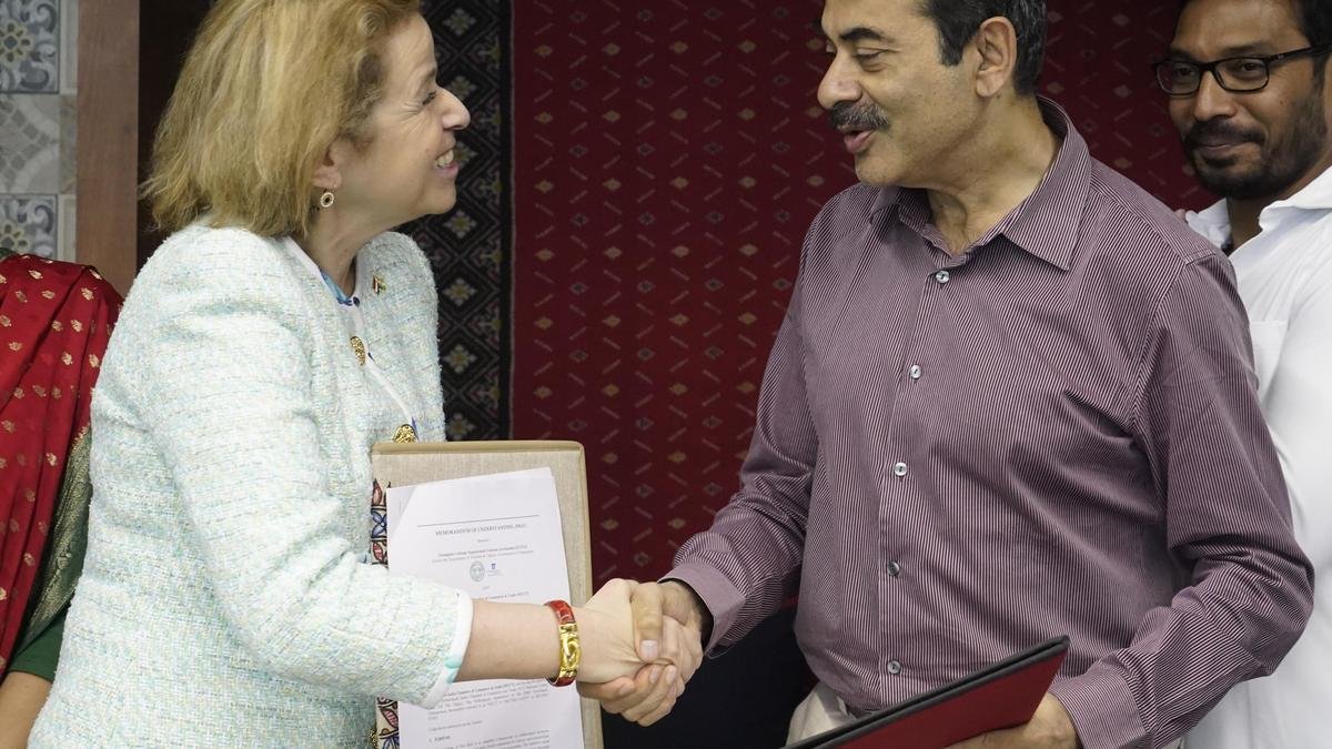 Telangana Tourism Special Chief Secretary Jayesh Ranjan signing an MoU with Chairperson of Netherlands India Chamber of Commerce and Trade, Edith Nordmann at We Hub in Hyderabad on Wednesday, November 12, 2025.