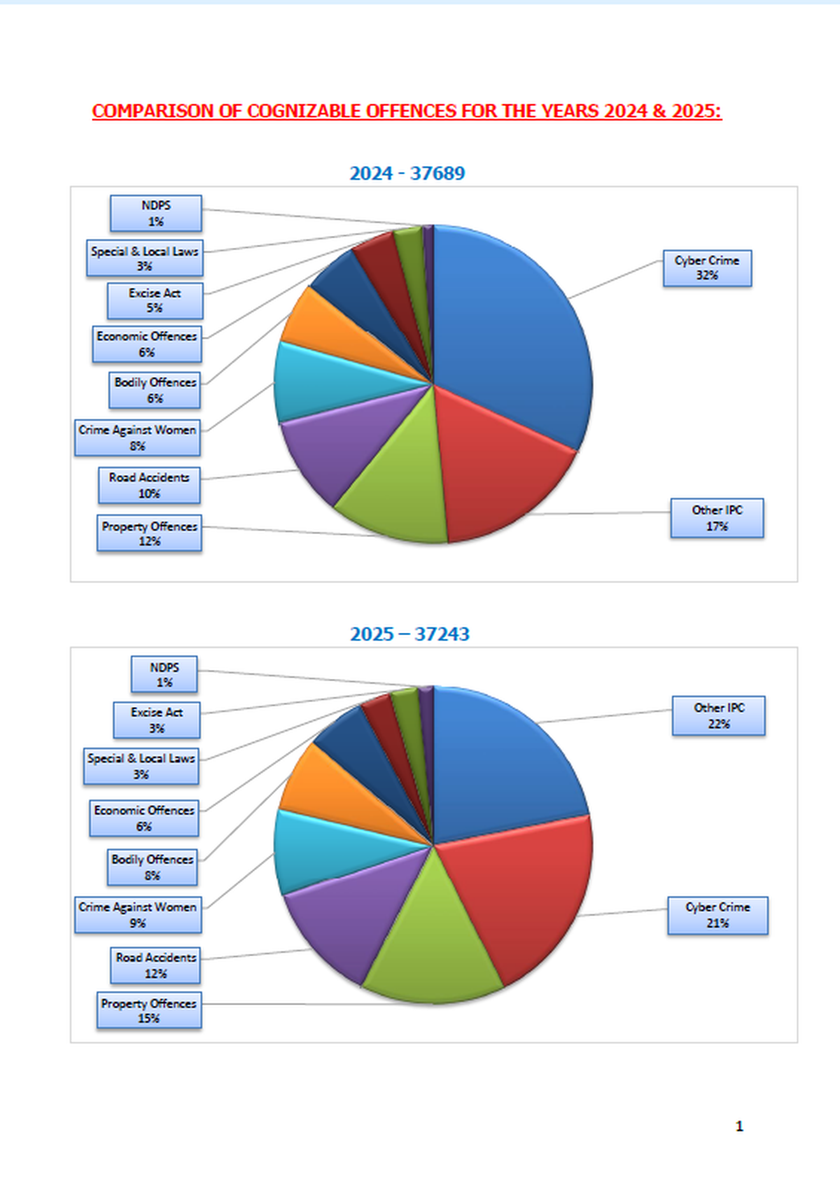 Despite the overall drop, property offences made up 15% of crimes, up from 12% in 2024, followed by road accidents, which accounted for 12% of cases, up from 10% in 2024. Crimes against women marginally increased from 8% to 9%. Cybercrime continued to form the single largest category of offences at 21%, though its share declined substantially from 32% in 2024.